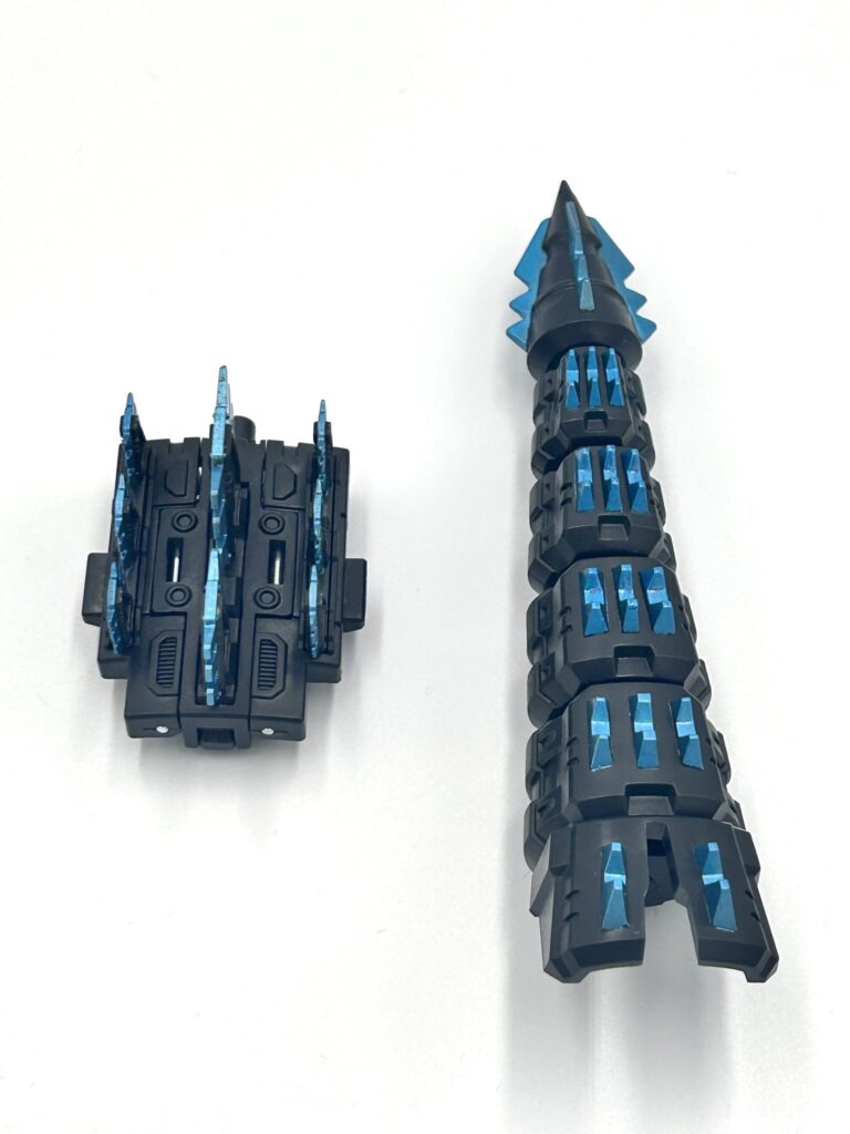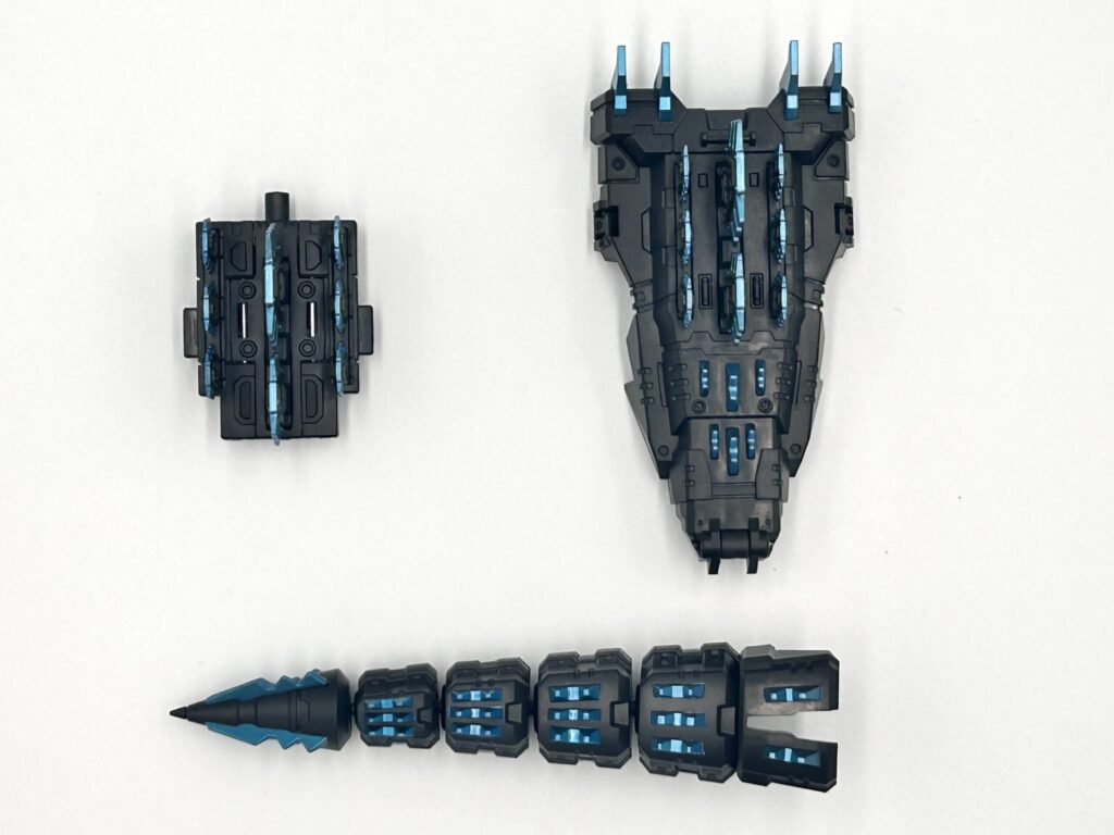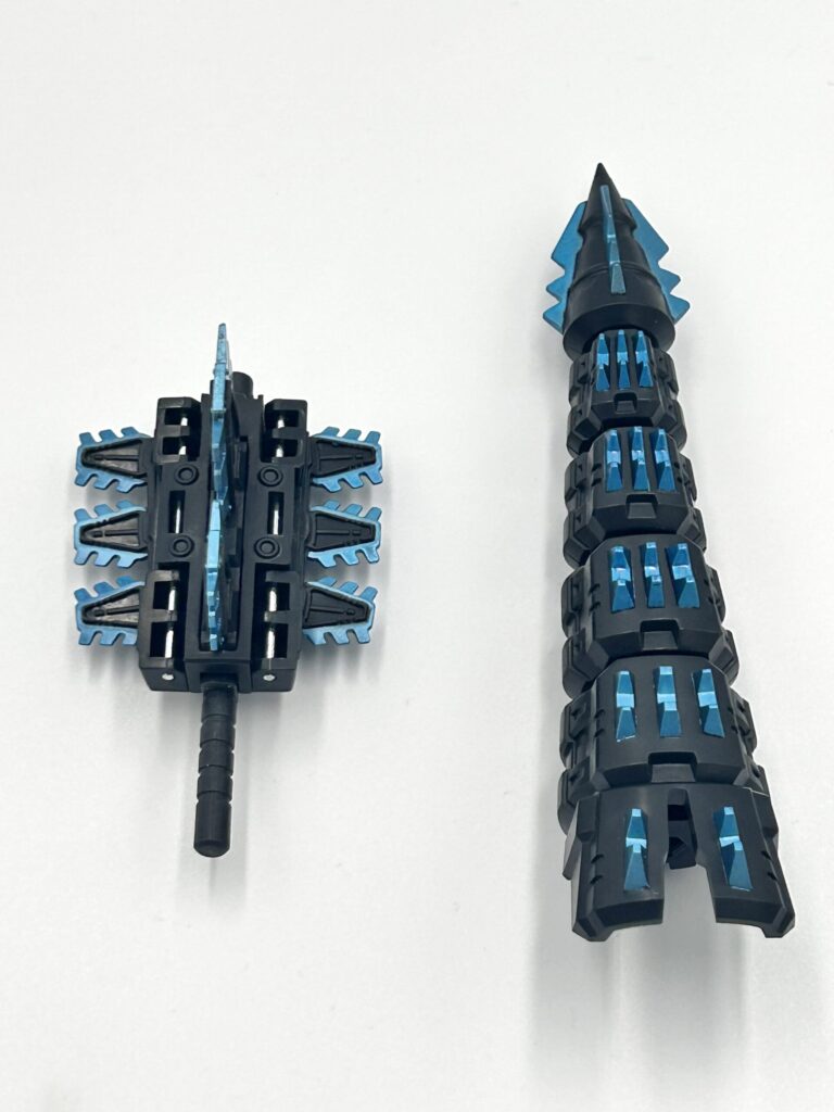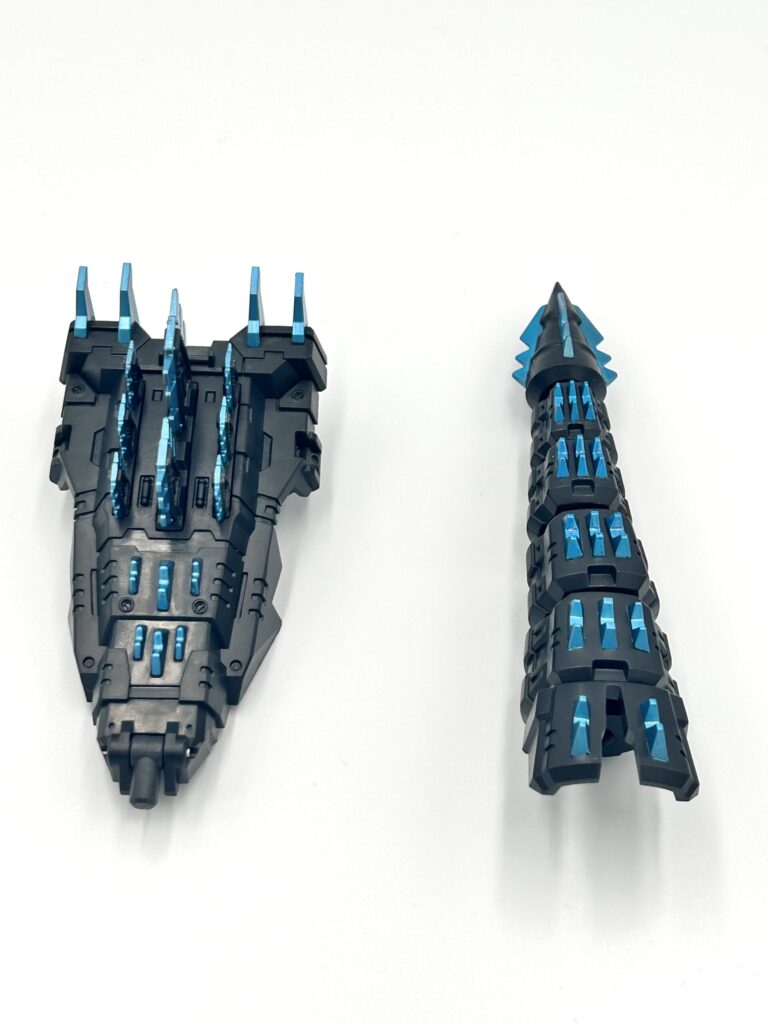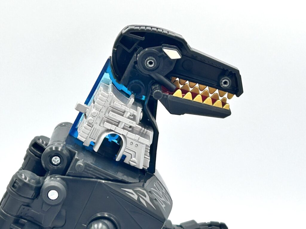 ロボットモード時には、背びれパーツと尻尾パーツを合体させることで武器に変形させることができます。