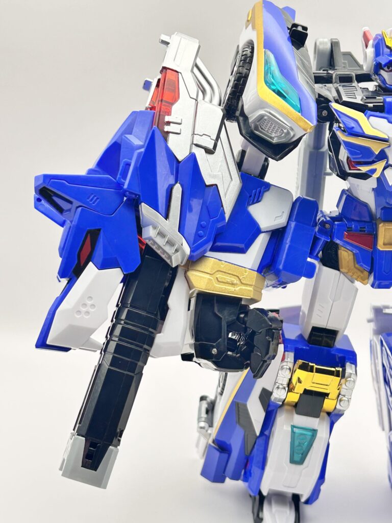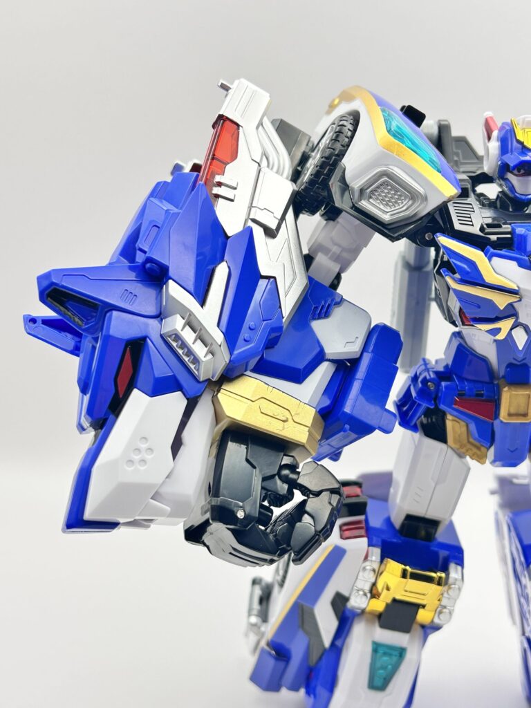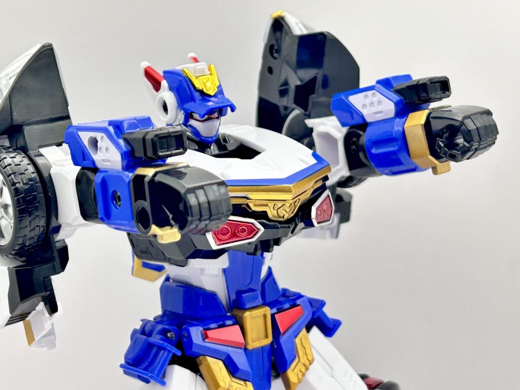 胸には車体のフロント部分があり、上半身部分の見た目が良いものなっています。肩部分も大型化しており、力強さが増しています。手のパーツは、前回は”手を開いている造形”でしたが、今回からは”握り拳”に変更されています。背面もスッキリしていて、無駄なものがないって感じです。
