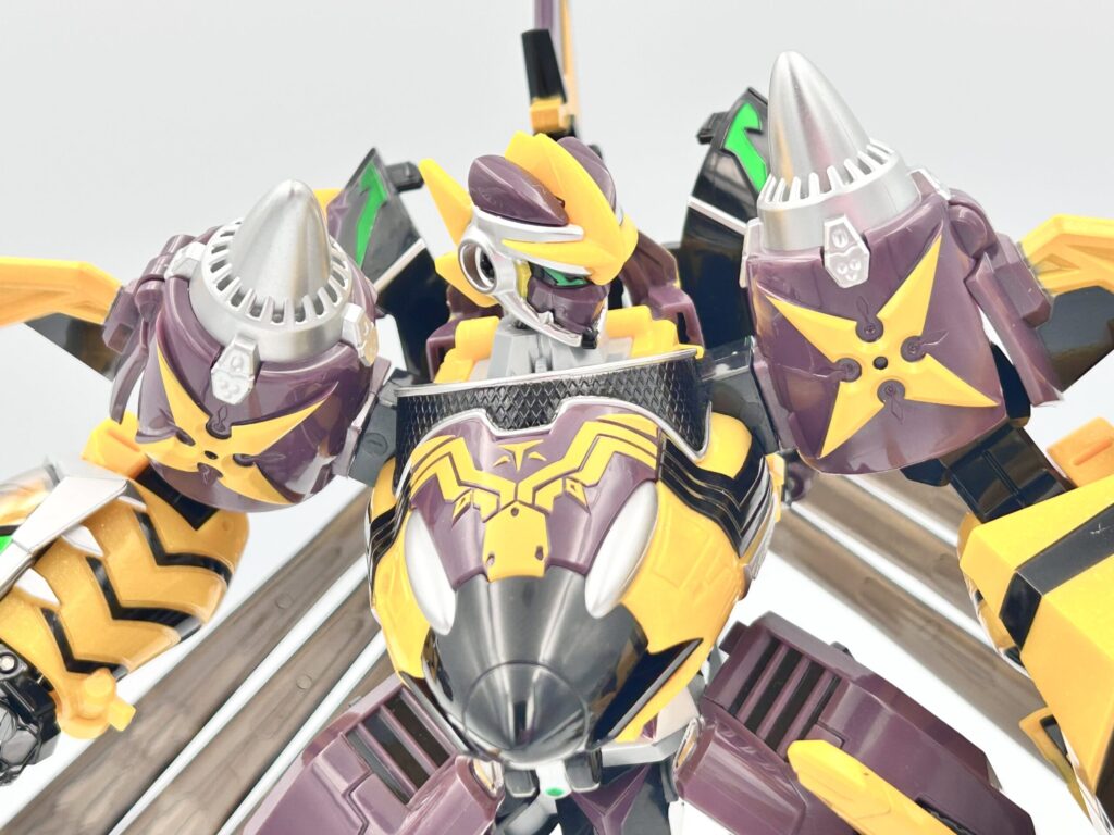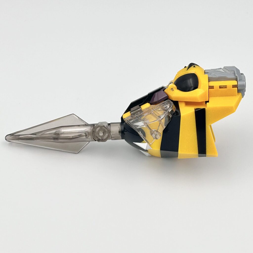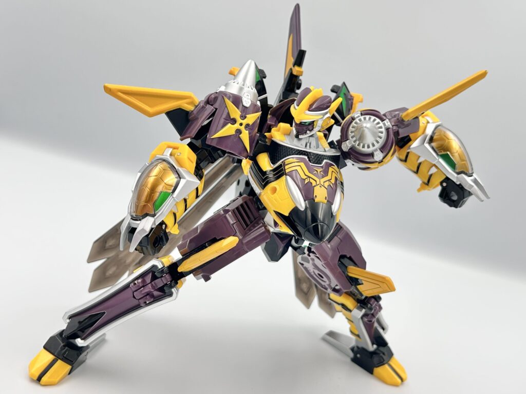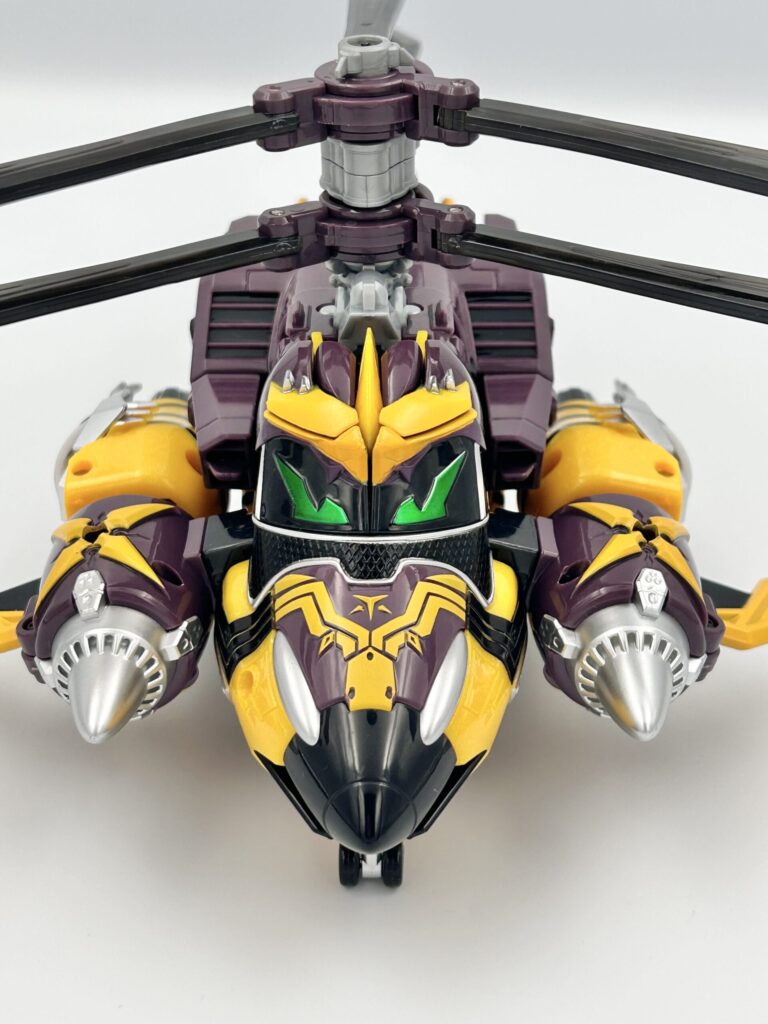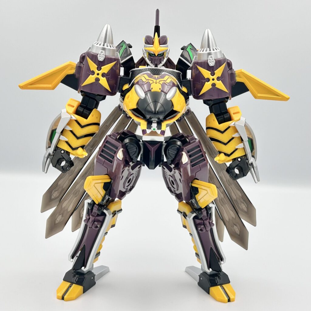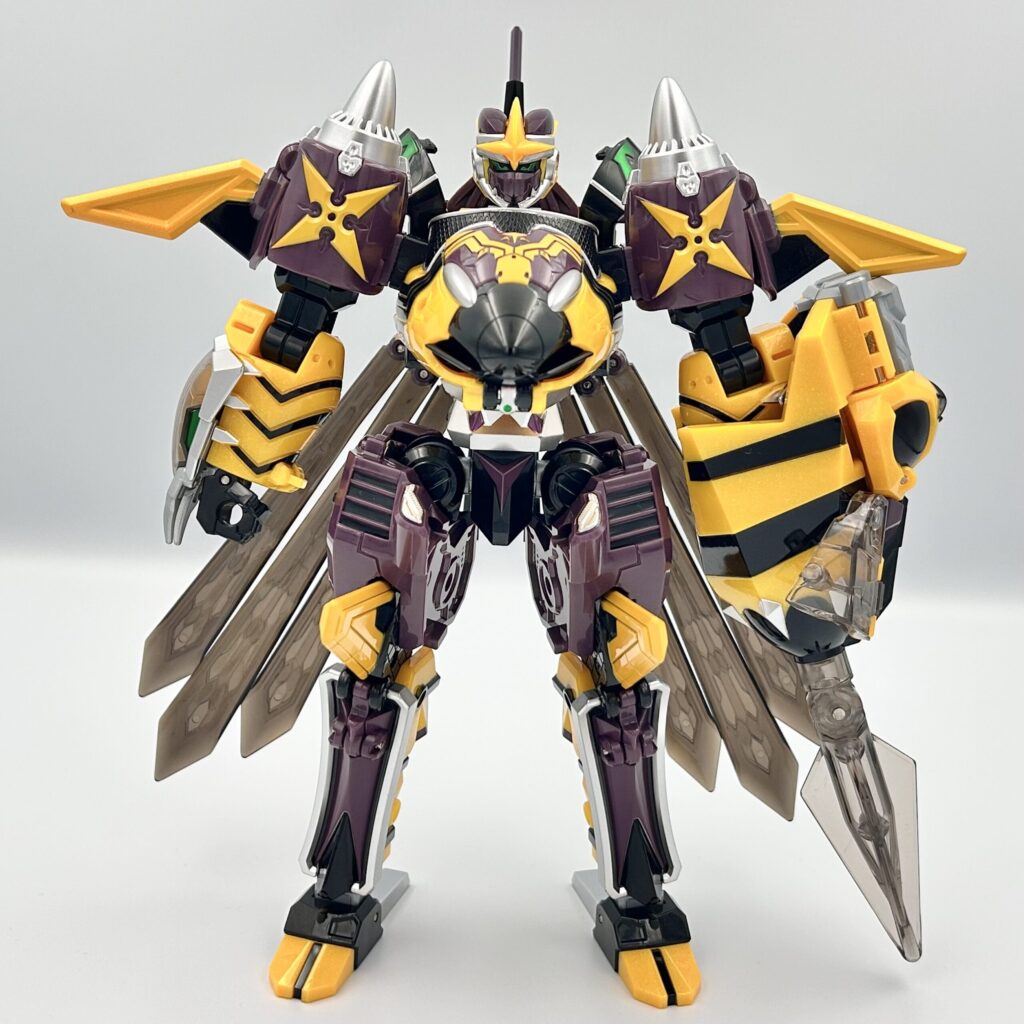 全身の忍者を彷彿させる造形に、蜂を組み合わせたカラーリング。胸部分の造形、背面にはローターブレードが変形した羽と、全体的に造形美がとても美しく、目でも楽しませてくれる玩具だと感じました。