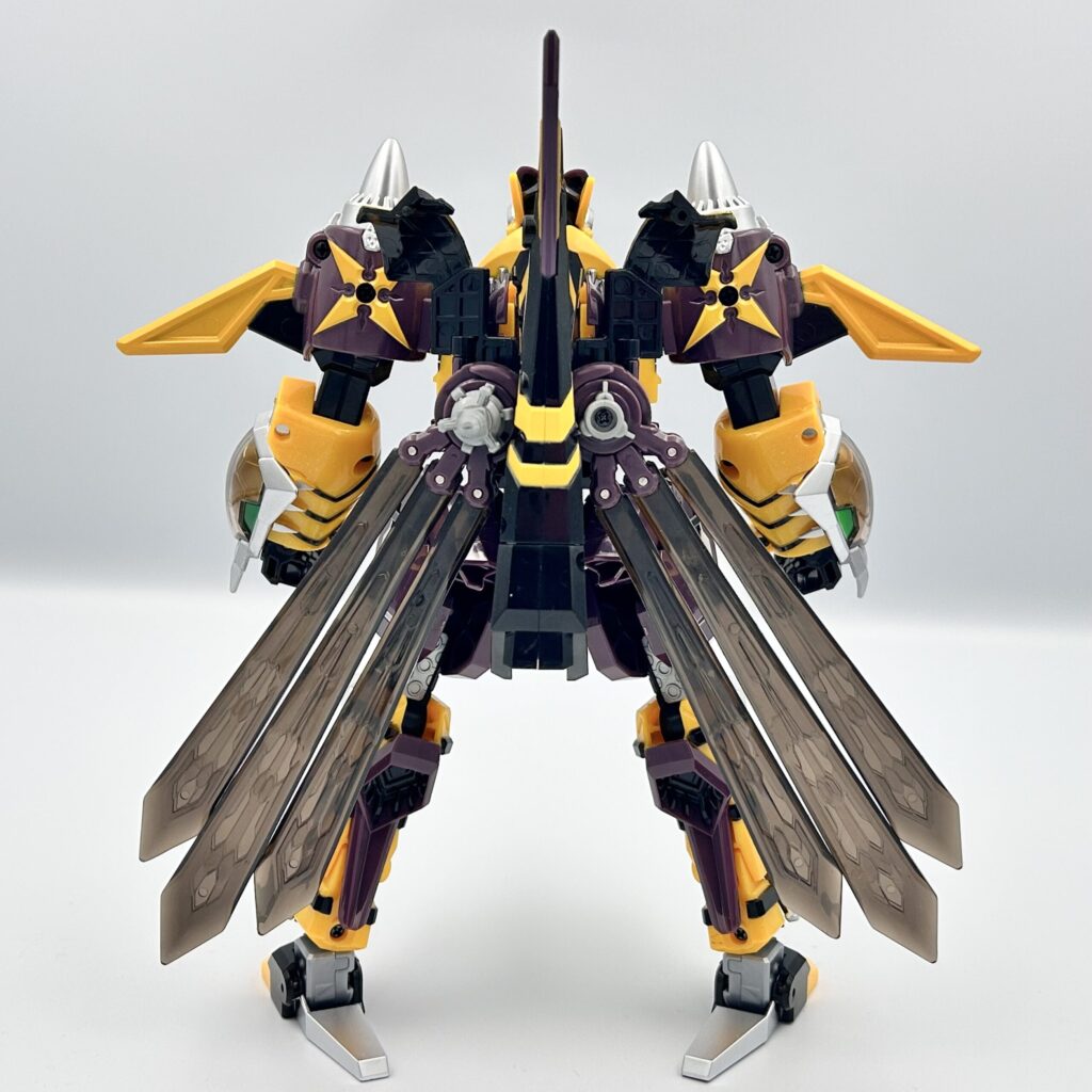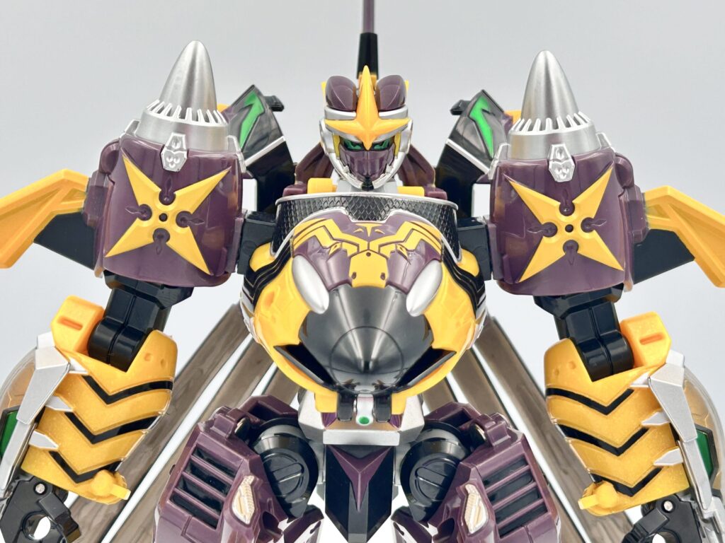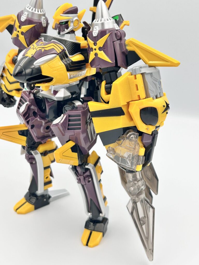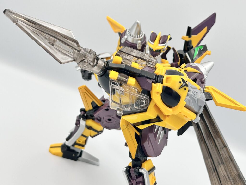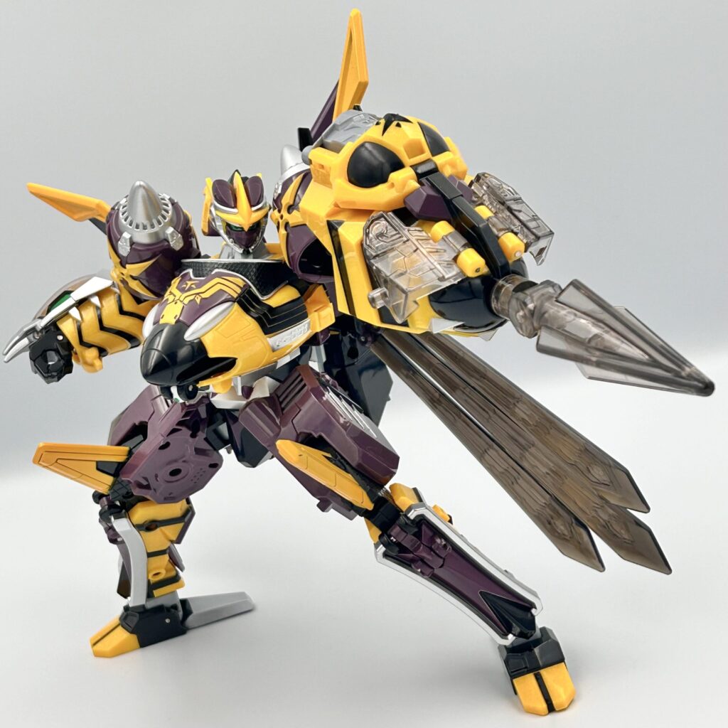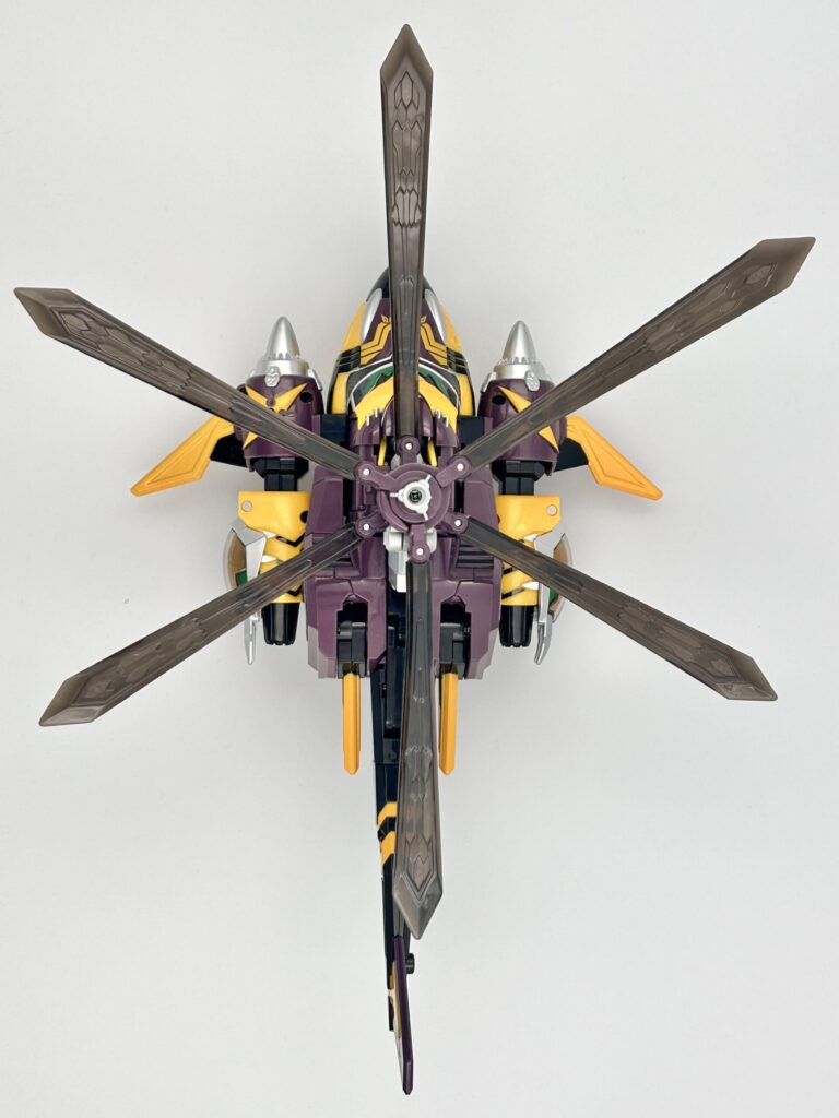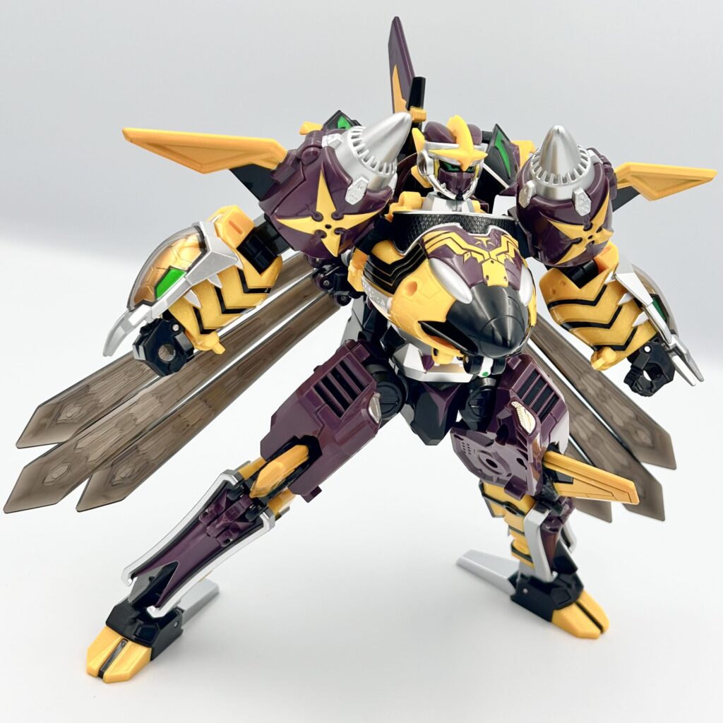 全身の忍者を彷彿させる造形に、蜂を組み合わせたカラーリング。胸部分の造形、背面にはローターブレードが変形した羽と、全体的に造形美がとても美しく、目でも楽しませてくれる玩具だと感じました。