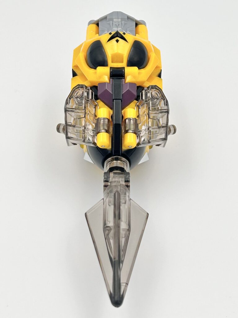 正面には蜂の顔、特徴的な縞模様、クリアパーツは羽、そして大きな毒針と、武装そのものに蜂の造形が見て取れます。