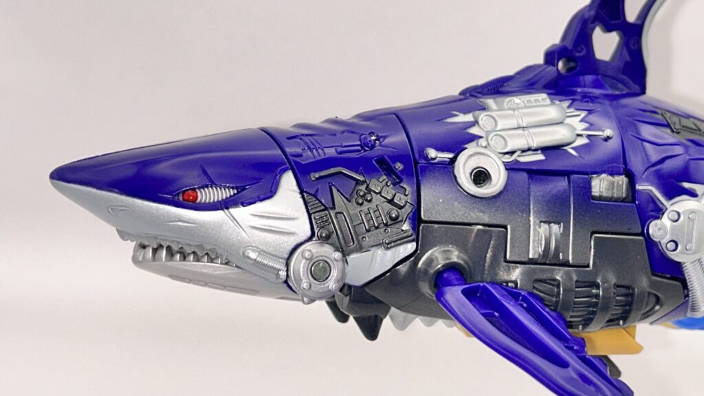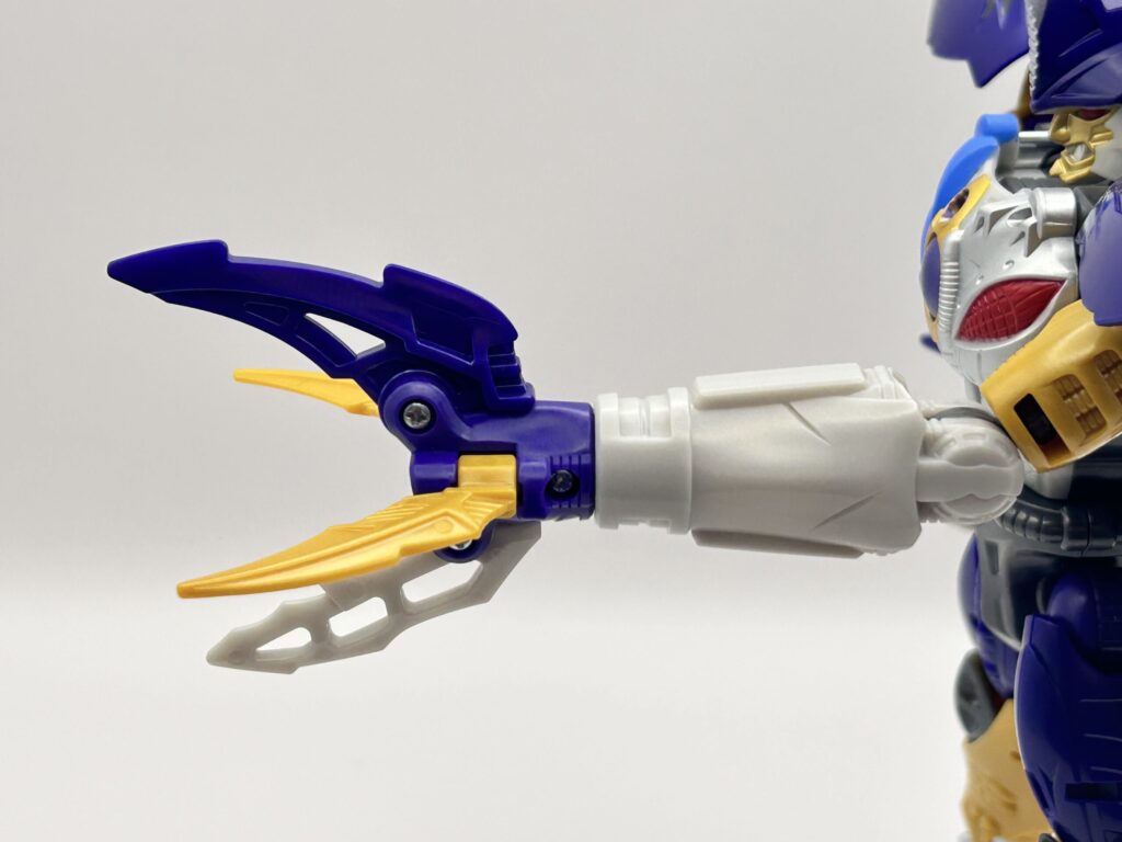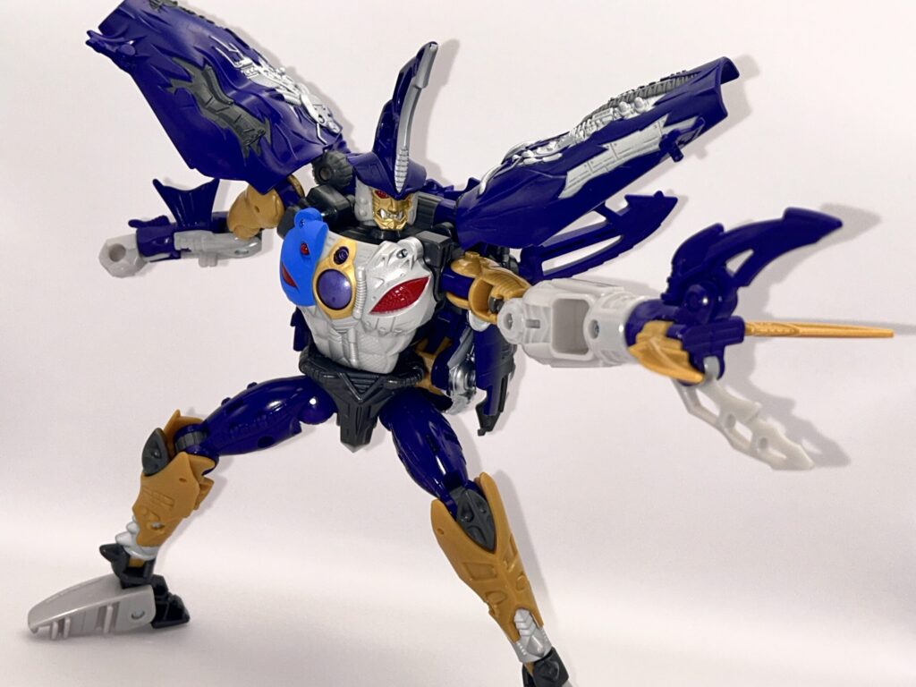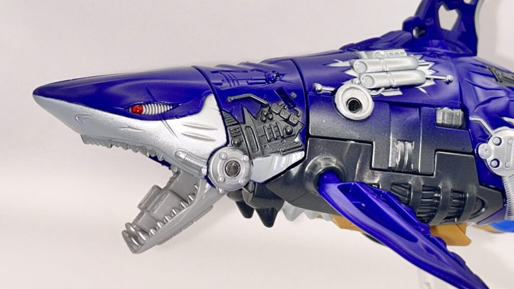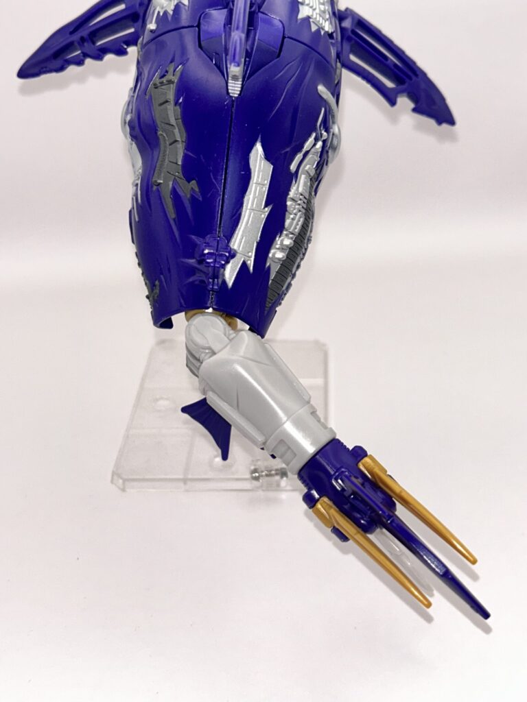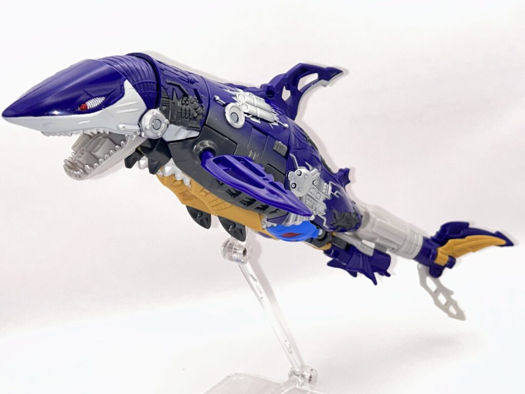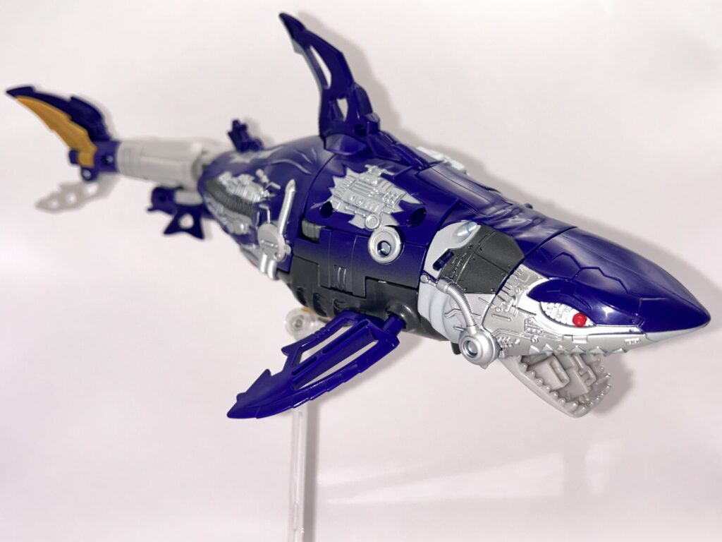 トランスフーム後は、尾ビレが左腕に変形した巨大な『アンカーアーム』と、ビーストモード時の背ビレが変形した頭が印象的な姿になります。変形も難しくないです。何度も変形させたくなります!